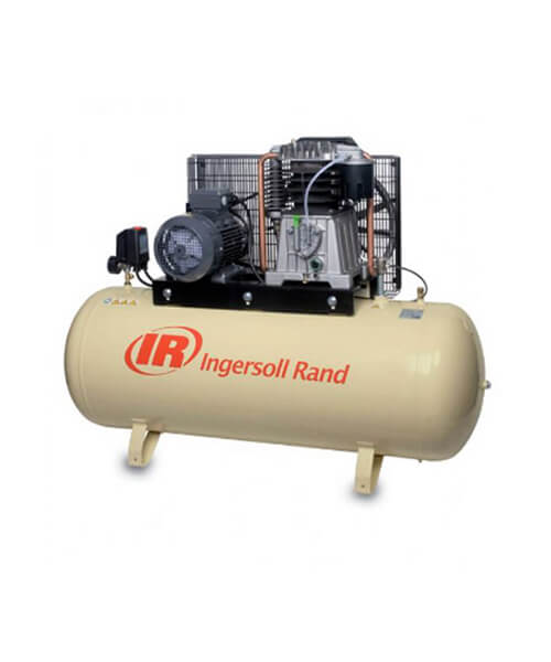 Os compressores estacionários montados sobre reservatório com transmissão por correias estão disponíveis com motores de entre 4 e 7,5 kW e são projetados para aplicações de serviços intermitentes, como racks, carpintaria, manutenção de veículos e manutenção geral. Estes compressores estão equipados com cilindro de ferro fundido, uma roda com correia equilibrada para um trabalho mais uniforme, pressostato para paragem e arranque automáticos, motores TEFV, também vêm de fábrica com lubrificante.