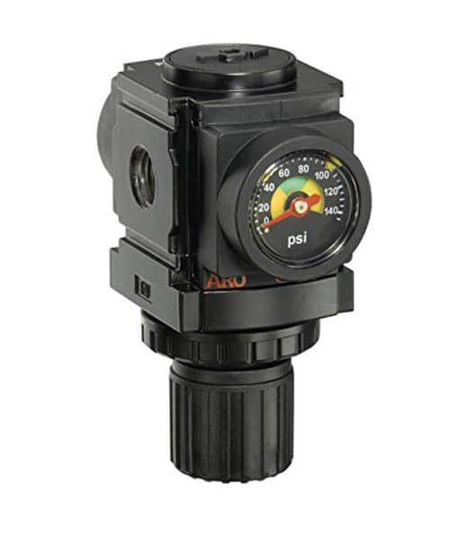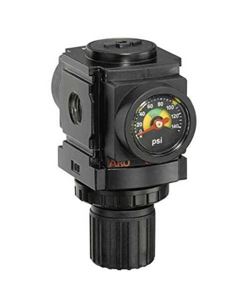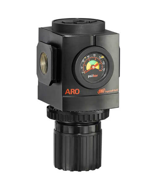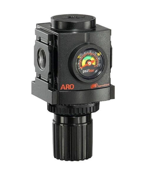 Reguladores para linhas de ar fornecem a pressão de ar controlada e constante requerida por certos equipamentos pneumáticos conectados ao sistema pneumático. Todos os reguladores ARO-Flo são ajustados com uma faixa padrão de 0 a 140 psig (0 a 9,6 bar). Outras margens podem ser ajustadas para obter uma conversão simples e satisfazer requisitos diferentes. Existem reguladores sem alívio para as aplicações nas quais não é conveniente ventilar a sobrepressão descendente.